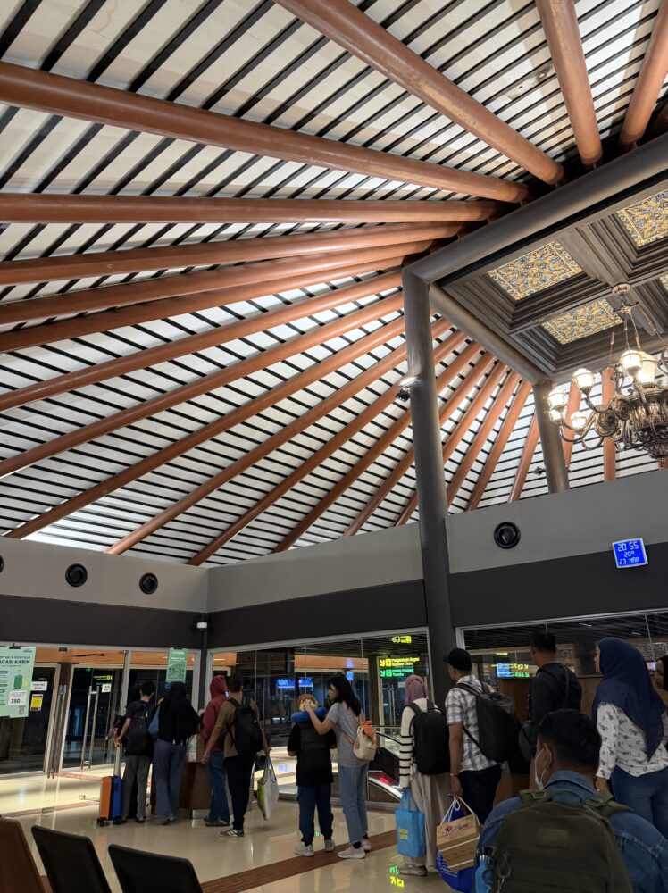 天井には木材を多く使ったデザインが採用されており、インドネシアらしい温かみのある空間になっています。天井から下がるシャンデリアのような照明も印象的で、空港というよりもホテルのロビーのような雰囲気です。