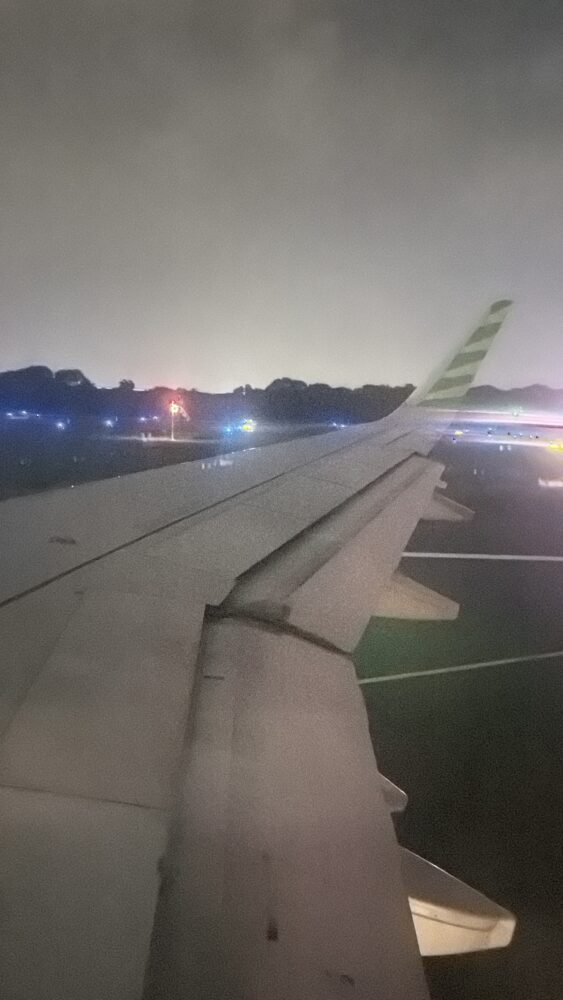 窓の外には滑走路のライトが広がり、これから夜のフライトが始まることを実感します。