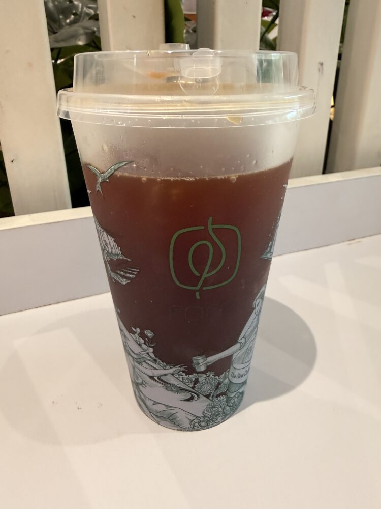 透明感のあるプラスチックカップには、美しいイラストとFOREのロゴが印刷されており、細部までブランドの世界観が統一されています。