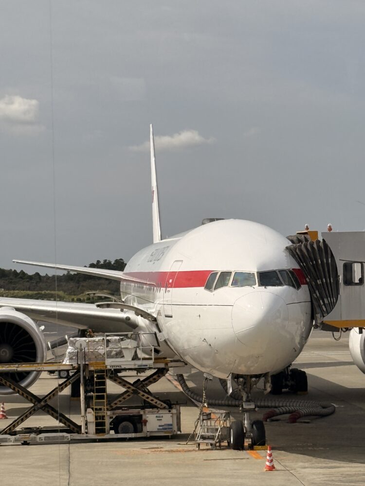 搭乗口26番に到着すると、窓越しに見えたのは見慣れたガルーダブルーではなく、赤と白のインドネシア国旗を思わせるツートーンの特別な機体。今回の便は、なんとインドネシア大統領専用機材として使われる特別塗装のボーイング777-300ER「PK-GIF」でした。大統領が公式訪問などで使用し、空いているときに通常便として運航されているとのこと。飛行機好きにはたまらないサプライズで、思わずテンションが上がります。