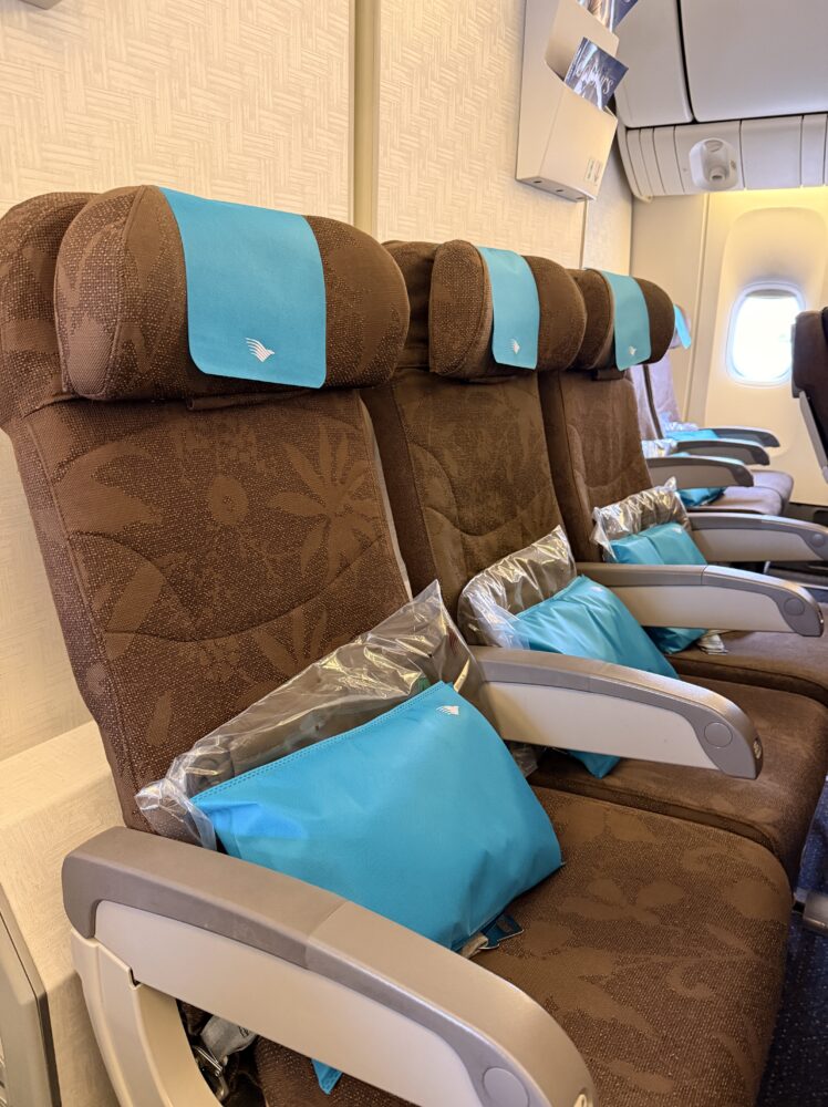 搭乗開始。今回の座席はエコノミークラスの51H、通路側です。長時間フライトではやはり通路側が便利。ほぼ満席でしたが、最後列の中央シートは個人モニターの音声が故障しているとのことで、そこを自由に使ってよいとの案内がありました。バッグや上着を置いたり、体をひねって足を伸ばしたりと、想定外の快適スペースを確保。小さな余裕が長いフライトを大きく変えます。