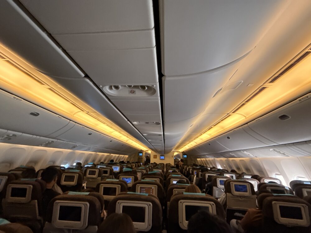周囲を見渡すと、観光客らしき家族連れやカップルが楽しそうに過ごしています。私は仕事のための渡航ですが、こうして空の上でゆっくり考えごとをする時間はとても貴重です。パソコンを開かず、イヤホンで音楽を聴きながらコーヒーを味わう──そんな贅沢なひとり時間を楽しめました。エコノミーでも、こうした小さな余裕があるだけで快適度が格段に上がります。
