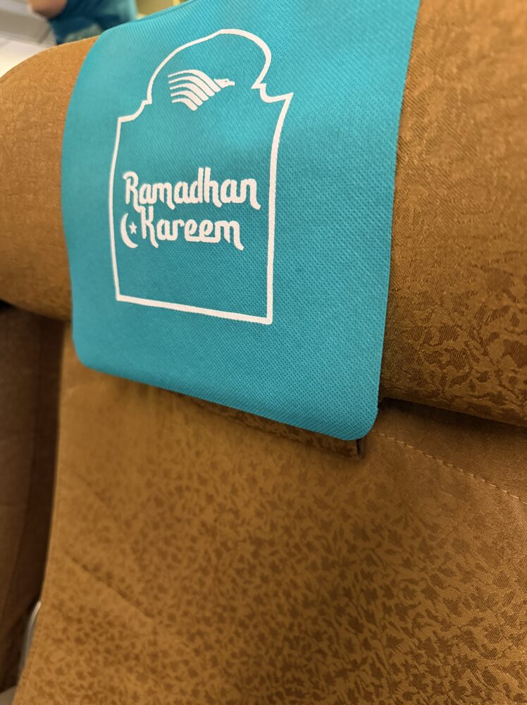 機内に入ると座席にはラマダン仕様のヘッドレストカバーが付いていました。