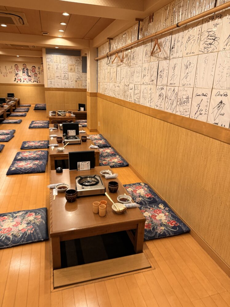 畳敷きの掘りごたつ式テーブルが並び、和の落ち着いた雰囲気が広がる空間。テーブルにはすでに小鉢と鍋が用意されており、これから始まる宴への期待が一気に高まります。