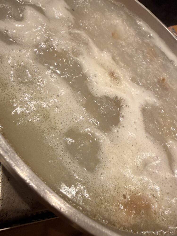 続いて登場したのは大皿に盛られた鶏のミンチ。見るからに上質で、スプーンで丸めて鍋に落とすと、ふわりと湯気と香りが立ち上ります。