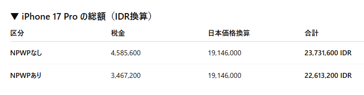 ➡ NPWPなしの場合はインドネシア現地のほうが少し安い。