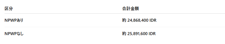 - NPWPなし → ほぼ同額、またはインドネシアが安い