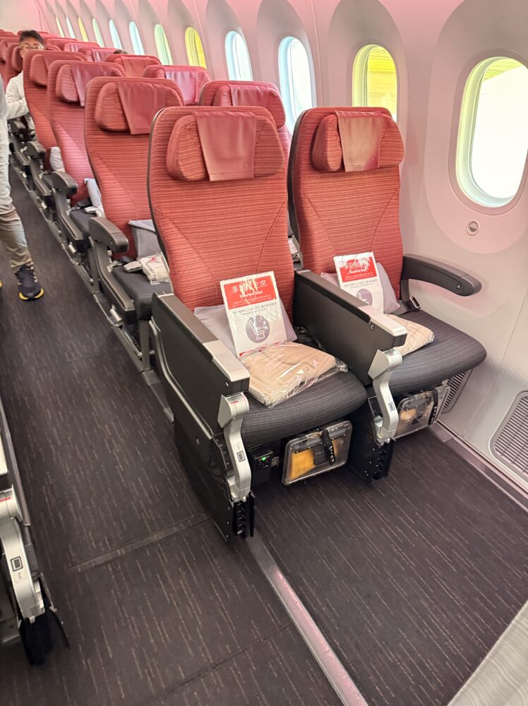 機内に足を踏み入れると、赤を基調とした落ち着きのあるシートが整然と並び、柔らかなLED照明がリラックス感を演出しています。今回の座席18Aは、エコノミークラスの最前列に位置し、目の前にはビジネスクラスとの仕切りがあるのみ。足元のスペースは圧倒的に広く、窮屈さをまったく感じません。