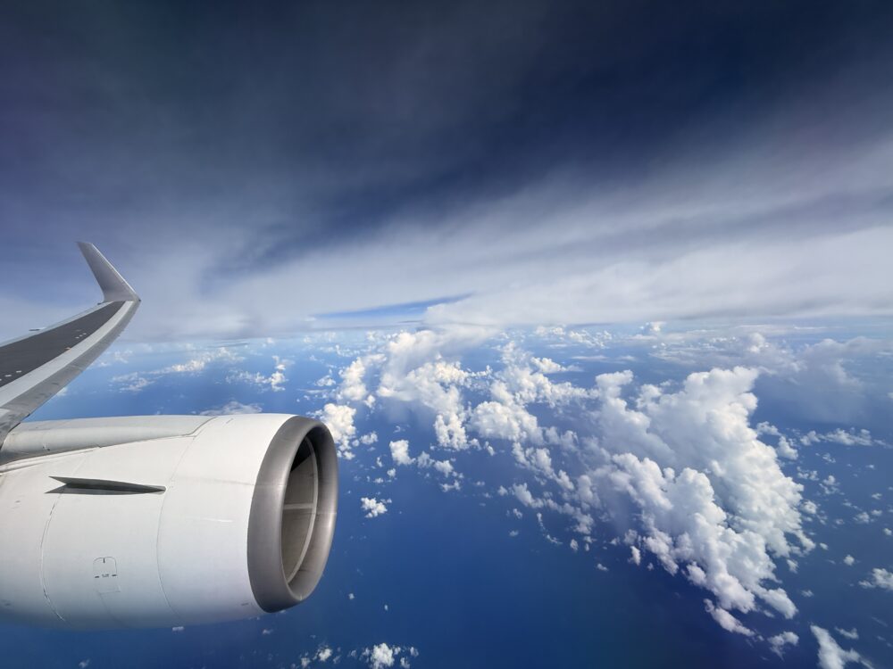 機体がふわりと浮かび上がった瞬間、翼の上を流れる雨の筋が光を帯びて消えていく様子が印象的でした。雲を抜けたあとは一面の白い世界。やがて青空がのぞき、気持ちも晴れやかになります。