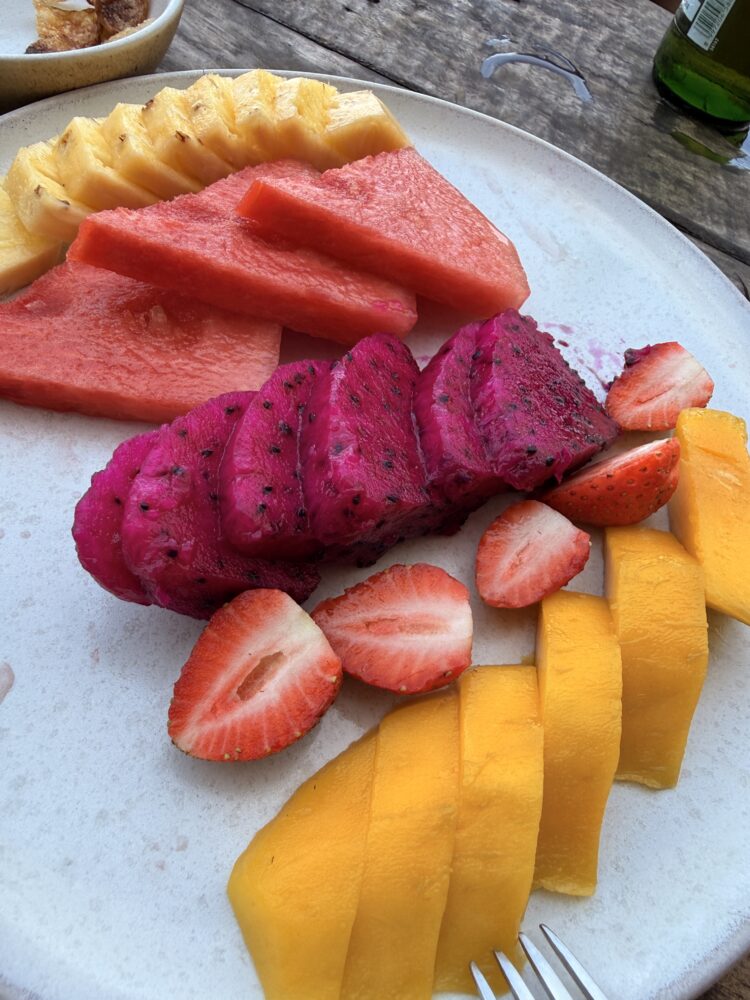 ナイフを入れると、卵黄がとろりと流れ出し、焼きたてのパンに染み込んでいく瞬間がたまりません。そしてデザート代わりに注文したトロピカルフルーツプレートは、まさに南国の宝石箱。マンゴー、ドラゴンフルーツ、パイナップル、スイカ、ストロベリー。どれも完熟の甘さで、海風に揺れる朝の光をそのまま閉じ込めたような味わいでした。