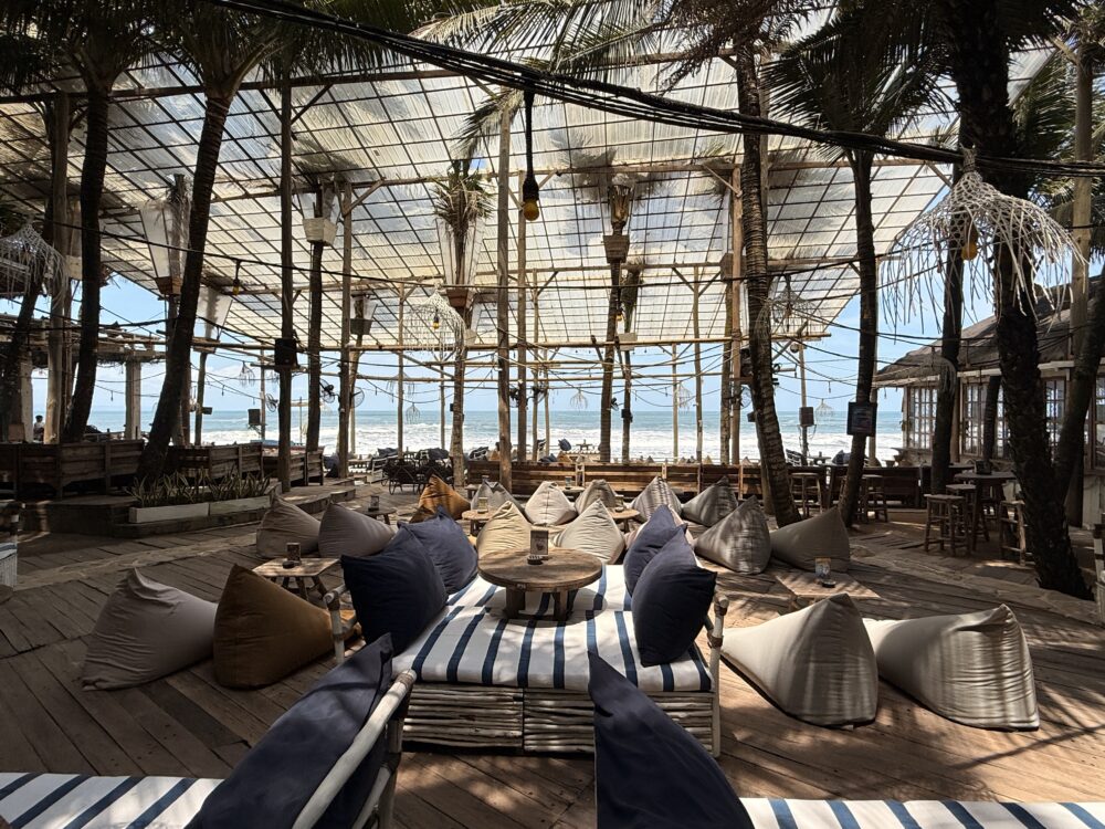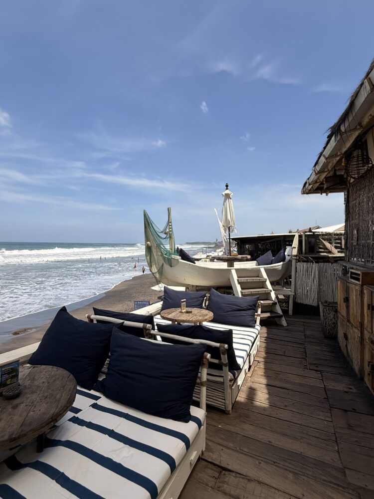 スタッフに案内され、海沿いのデイベッド席へ。白い木のフレームにネイビーブルーのクッションが映えるこのエリアは、La Brisaの象徴的な空間です。波打ち際に面したデッキからは、エコービーチの大きなうねりとサーファーたちのシルエットを眺めることができます。デイベッドに腰を下ろすと、柔らかな海風と潮の香りが頬をなでました。クッションにもたれながら空を見上げると、椰子の葉が風に揺れ、木漏れ日が優しくきらめいています。
