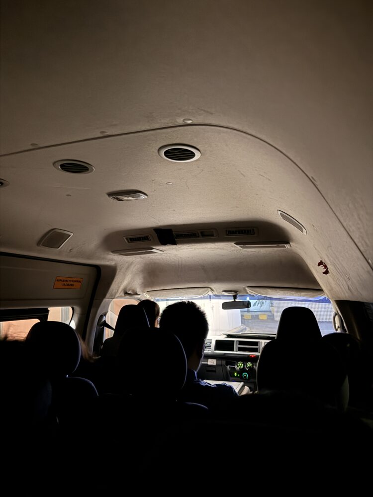 このシャトルは空港のターミナル3まで直接送ってくれるのが嬉しいポイント。ジャカルタの空港はターミナル間が離れていて移動が面倒なこともありますが、目的地の国際線ターミナルまで直行してくれるので迷う心配もありません。乗り込むとシートも清潔で、空港までの約15分間はちょうどよい目覚ましタイム。まだ真っ暗な空ですが、出発前の特別な空気を感じながら移動できました。