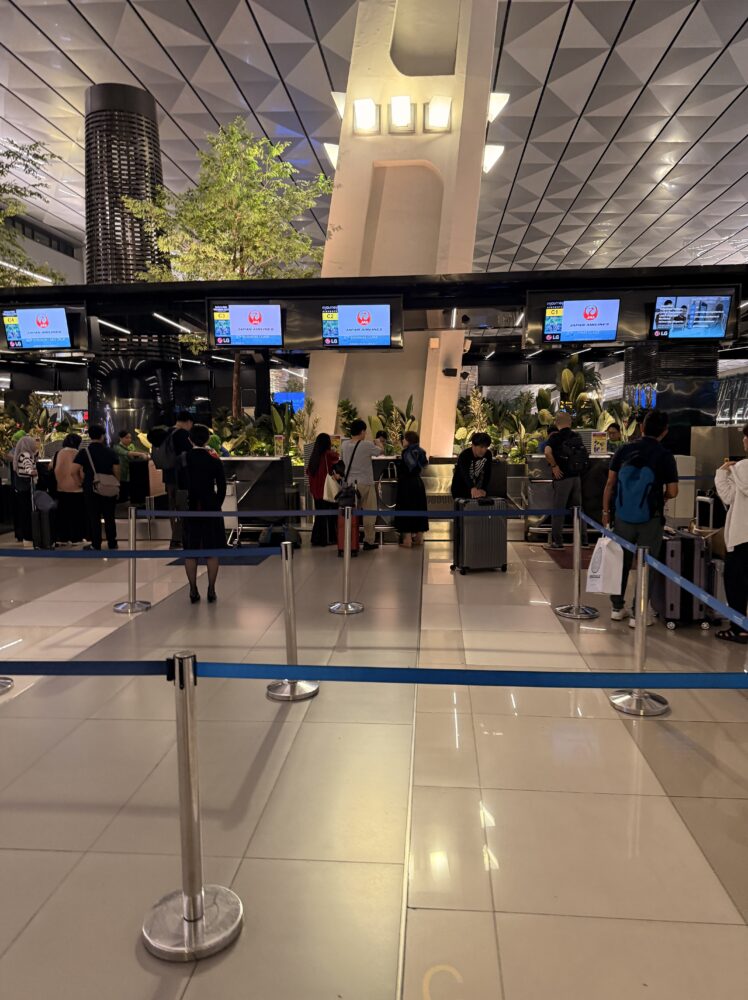 4時15分ごろ、スカルノハッタ国際空港ターミナル3に到着。まだ早朝ということもあり、空港内は人もまばらで落ち着いていました。今回はJAL720便で帰国。カウンターはすでにオープンしており、荷物を預ける列もスムーズで、待ち時間はほとんどなし。