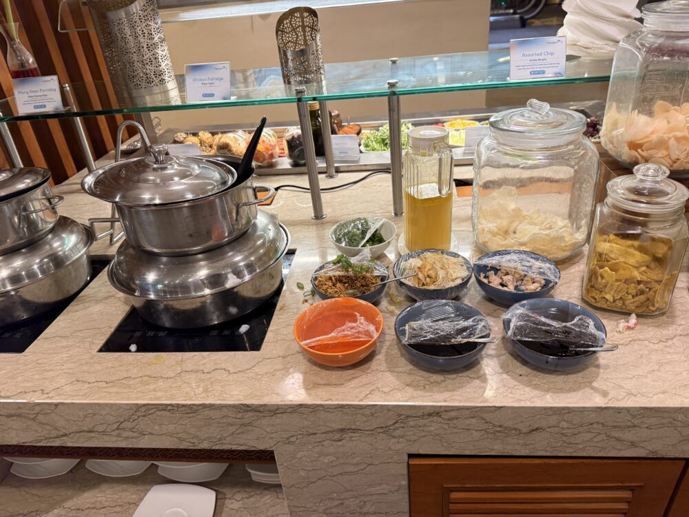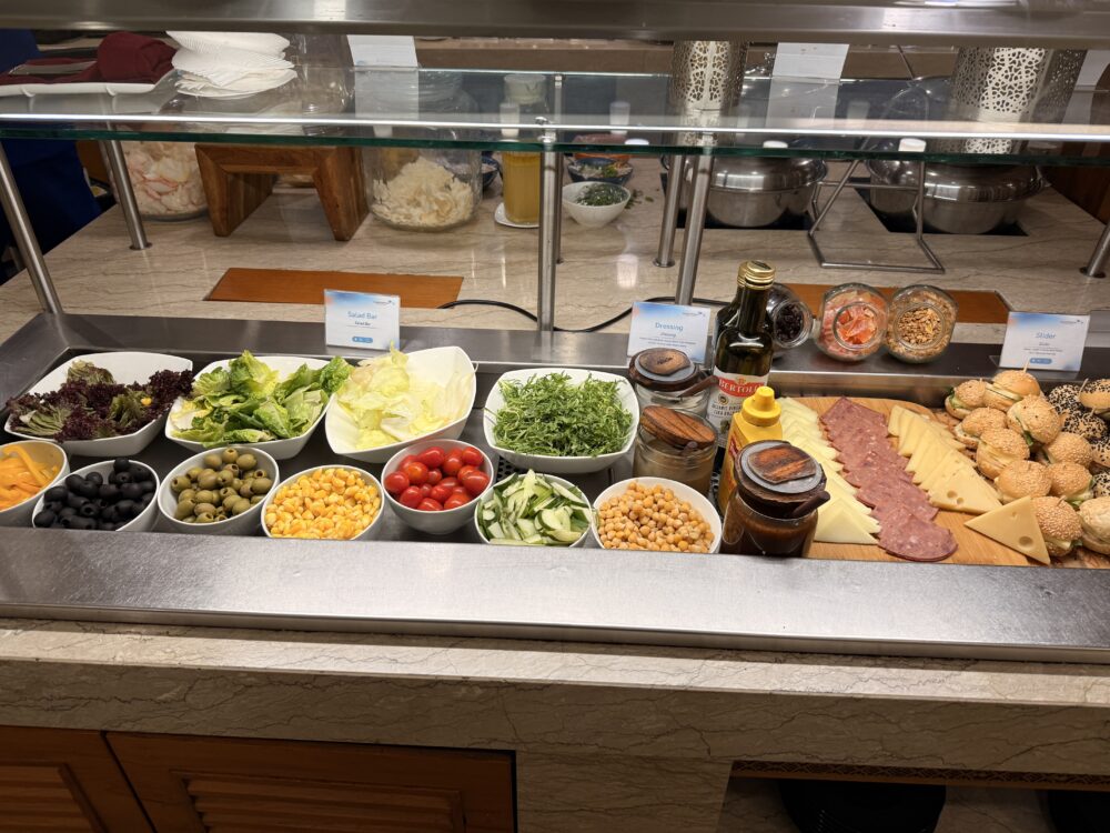 早朝4時台のため、ラウンジのビュッフェコーナーはちょうど準備中。それでもサラダバーや軽食、そして温かいおかゆが用意されていました。サラダは新鮮なレタス、トマト、オリーブ、コーンなどが並び、ドレッシングも数種類。小さなパンやチーズ、ハムも揃っていて、ちょっとした朝食には十分です。