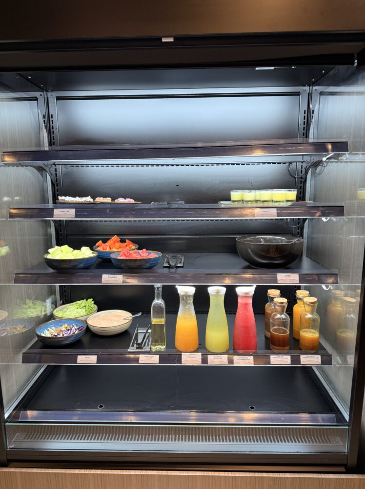 コーヒーや紅茶、ソフトドリンクはもちろん、冷たいジュースも自由に楽しめます。軽く食事をとりながら搭乗を待つには、十分すぎるほどのクオリティです。