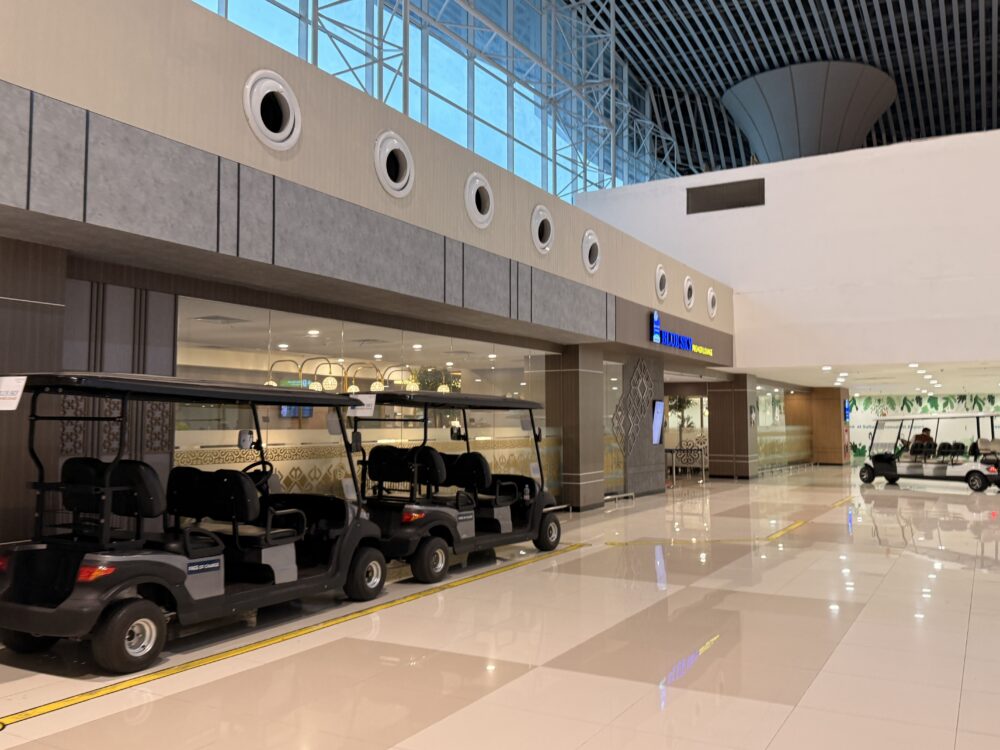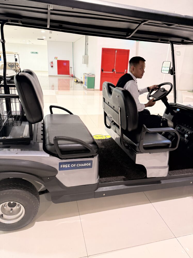 搭乗案内の時間が近づくと、ラウンジ利用者向けにバギー(空港内カート)の案内があります。