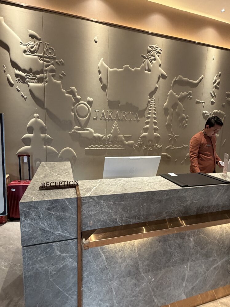 チェックインカウンターの後ろにはインドネシアの地図をモチーフにしたレリーフがあり、デザインとしてもなかなか印象的でした。