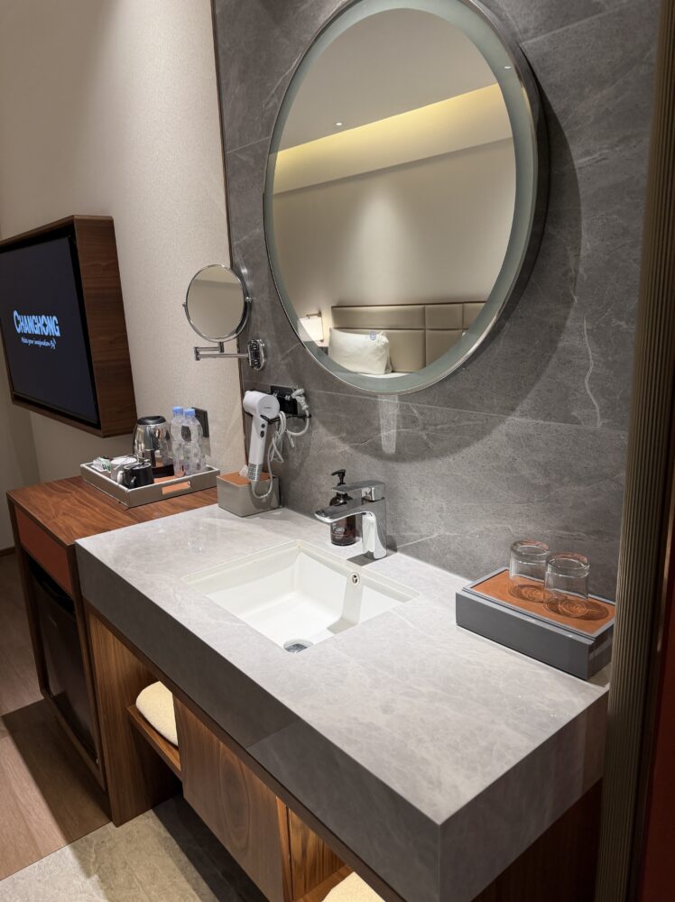 大きな鏡と広いカウンターがあり、スーツケースを開けていても余裕があります。