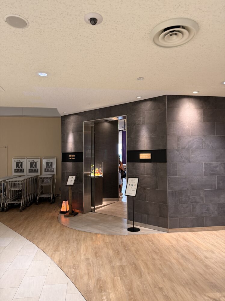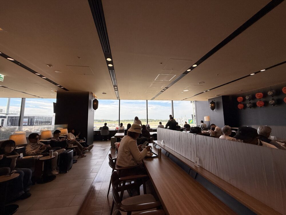 ラウンジに入ると、落ち着いた和モダンの空間が広がります。壁に並ぶ赤い提灯が印象的で、異国へ旅立つ前にほっと一息つける雰囲気。各席には電源も備わっており、搭乗前の時間を有効に使えます。