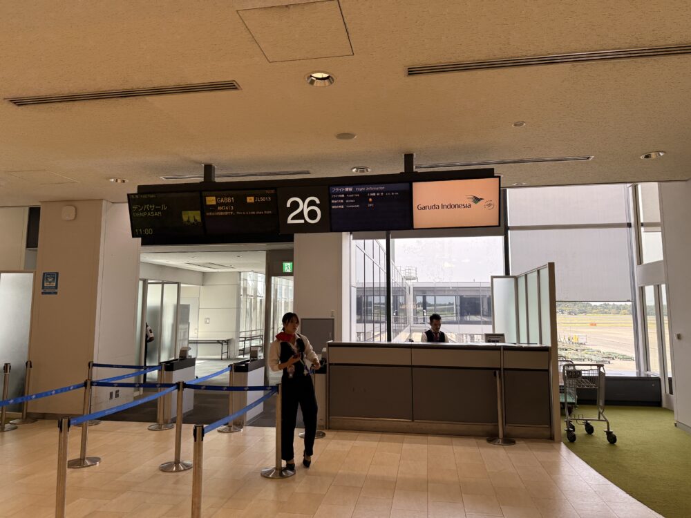 このラウンジの一番のメリットは、ガルーダ便の搭乗ゲートが本当に近いこと。ラウンジを出て数分歩けば26番ゲートに到着。広い空港内でも移動のストレスがなく、心に余裕を持てます。搭乗案内が始まったら、落ち着いた気分のままゲートへ向かいます。スクリーンに「GA881 Denpasar」の文字が表示されているのを見て、久しぶりのガルーダ便でのインドネシア行きに胸が高鳴りました。