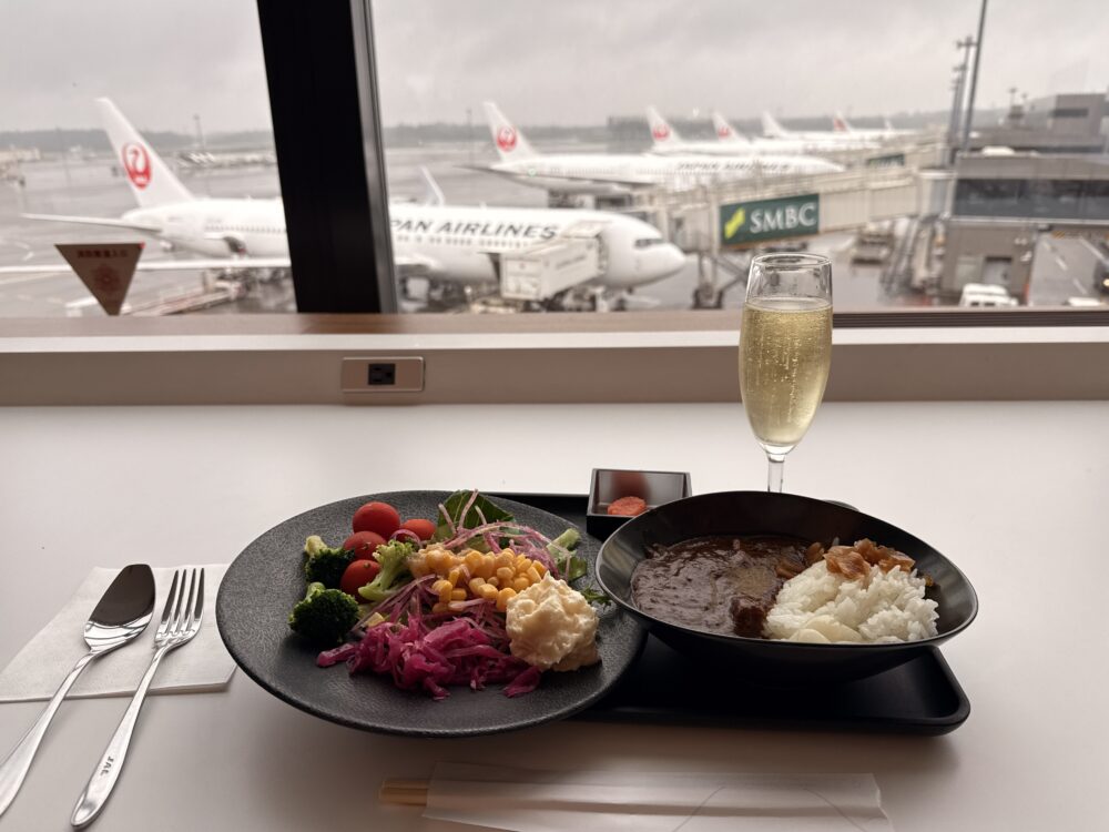 窓際のカウンター席に座ると、眼下にはJALの機体がずらりと並び、雨で濡れた滑走路に反射するライトが美しく輝いていました。旅の緊張を解いてくれる、心落ち着く光景です。