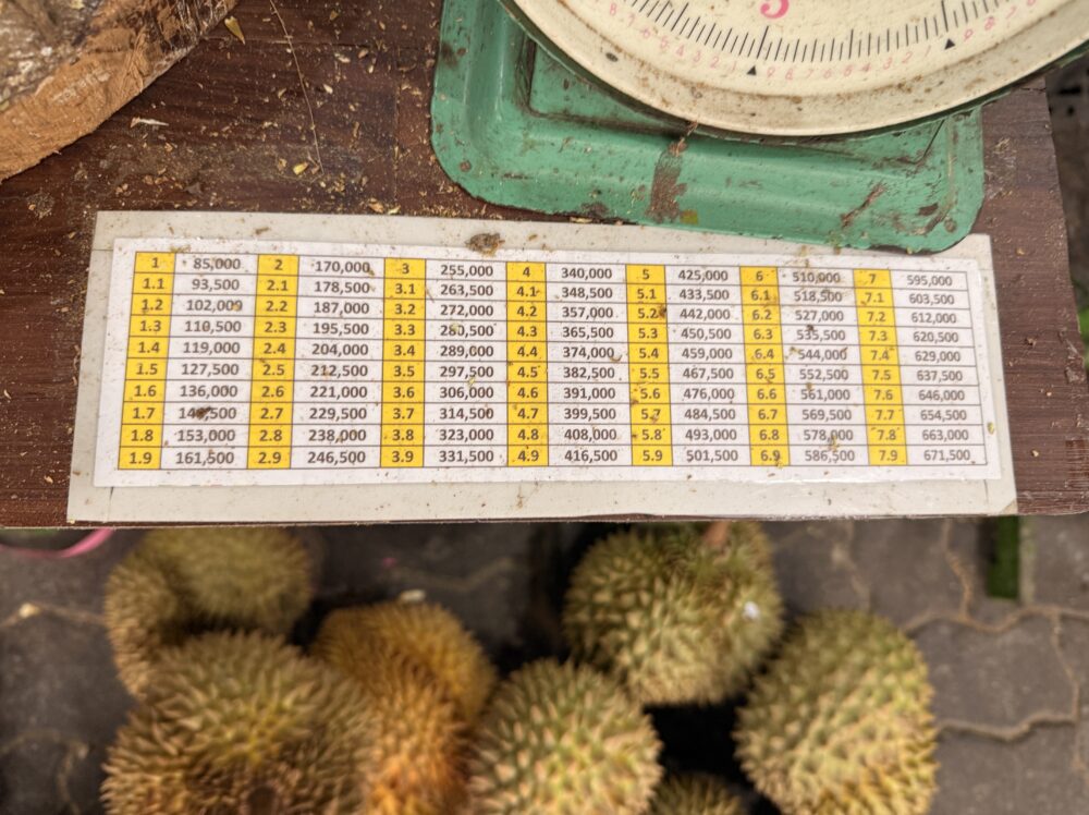 オリンピック・ドリアンでは、まず果実を選び、重さを量って価格を決めます。計りの横には価格表が貼られており、1kgあたりおよそ85,000ルピア(日本円で約800円前後)。果実の大きさによって価格が変わり、3〜4kgほどの実が一般的です。