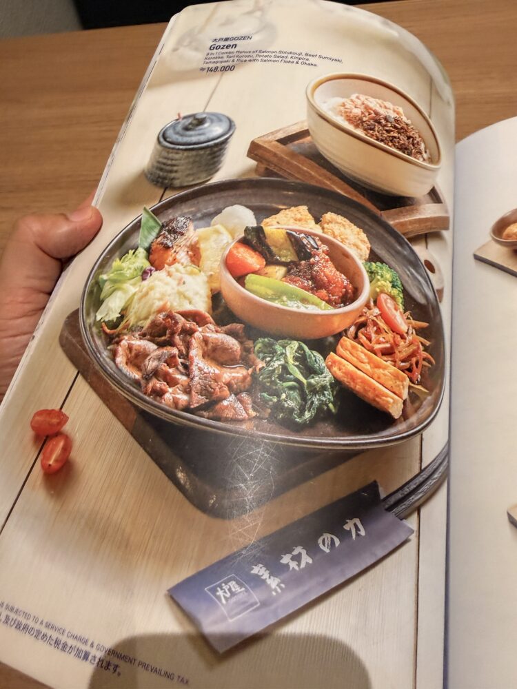 席に着き、手渡されたメニューの表紙からすでに日本の空気が漂ってきます。お箸とお盆、焼き魚や小鉢のイラスト――。ページをめくると、日本で見慣れたメニュー名がずらり。価格はジャカルタの物価からすれば少し高めかもしれませんが、それでもこの内容の和定食が楽しめるのはうれしいポイントです。彩り豊かな写真を眺めていると、思わず「どれも食べたい」と悩んでしまうほどでした。