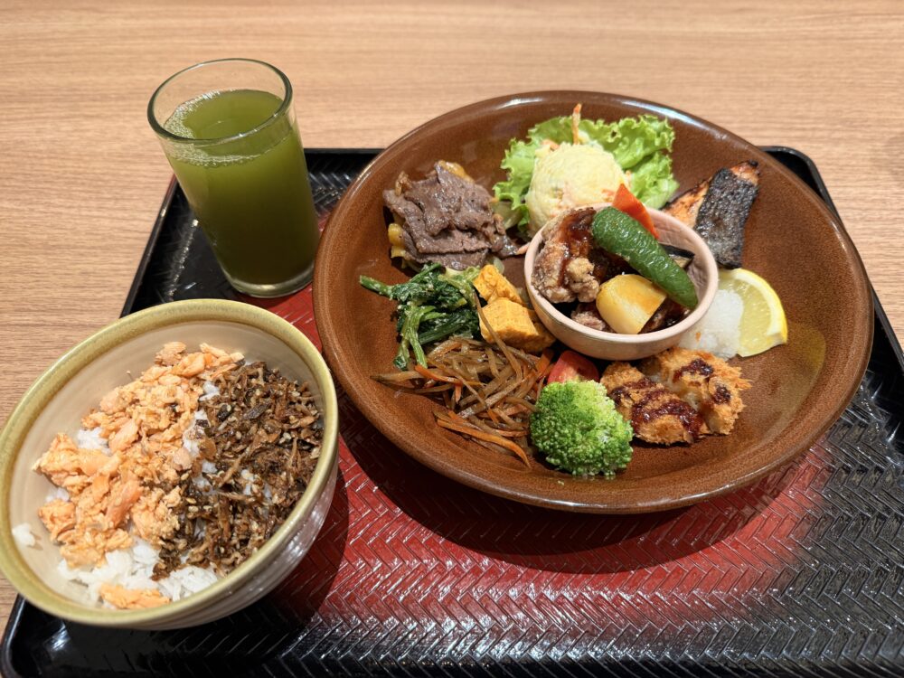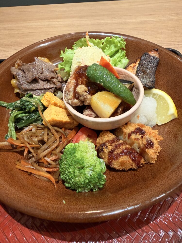 今回注文したのは、人気No.1の「大戸屋御膳」。運ばれてきた瞬間、その華やかさに心が躍ります。大きな丸いプレートには、肉・魚・野菜がバランスよく盛り付けられ、見るからに健康的。メインは香ばしく焼かれたサーモンと、甘辛いタレがしみ込んだ牛肉の炭焼き、鳥黒酢。そこに、コロッケ、ポテトサラダ、きんぴらごぼう、ほうれん草のおひたし、玉子焼き、ブロッコリー、フレッシュなサラダなど、まるで日本の家庭の食卓をそのまま一枚のプレートにのせたような内容です。