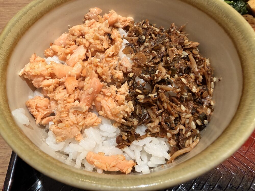 ご飯は鮭フレーク&おかかの二色仕立て