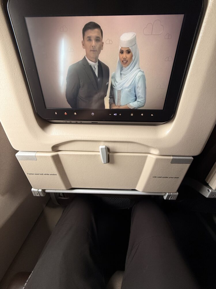 これまで数多くの航空会社に乗ってきましたが、出発前に祈りの映像が流れる航空会社は珍しく、ブルネイという国の文化がダイレクトに伝わってくる瞬間でした。機内は静かで、周囲の乗客も真剣に画面を見つめています。