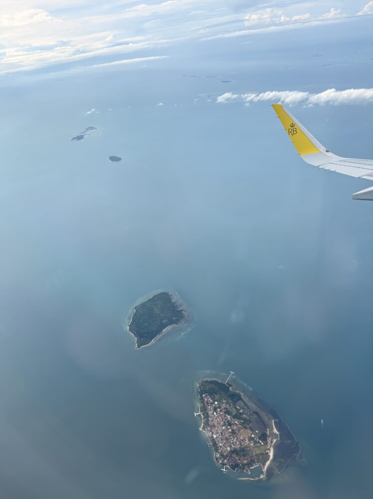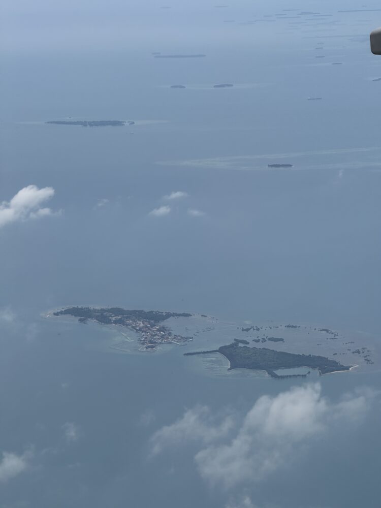 滑走路へ向かい、テイクオフ。大都市ジャカルタの景色を背に、機体はカリマンタン島へ向けて北上していきます。窓際の席から見えるのは、ジャカルタの北の海に浮かぶプラウスリブ(1,000の島)の小さな島々です。青く澄んだ海に点在する島は、都会から一気に別世界へ飛び込んだような気持ちにさせてくれます。
