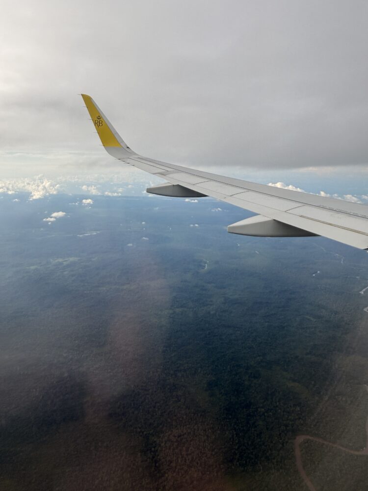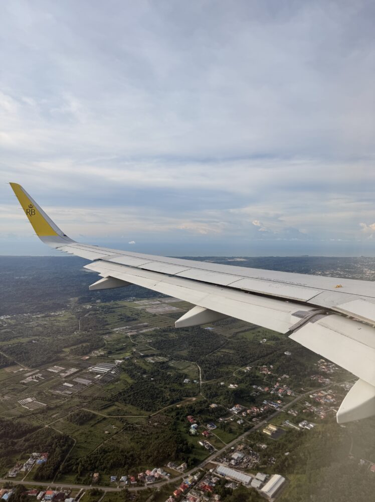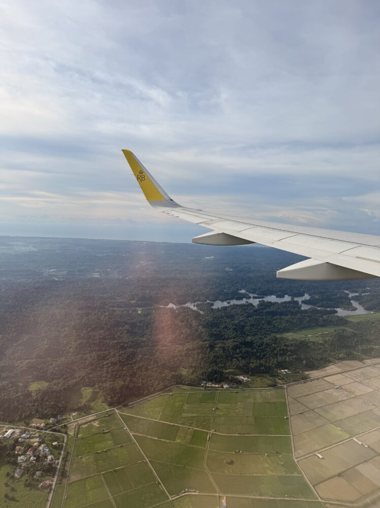 やがて機体は高度を下げ、ブルネイ国際空港が視界に入ってきます。空港はコンパクトで、周囲は森に囲まれ、とても静かです。東南アジアの首都の空港とは思えないほど穏やかな雰囲気が漂っています。