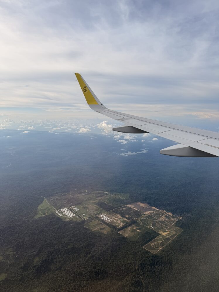 空から見るボルネオ島は、自然と人間活動の対比が強く、非常に印象深い景観でした。この島には、オランウータンやボルネオゾウなど、希少な野生動物が生息していると聞きます。しかし同時に、森林伐採や農園開発も進んでいる。複雑な現実が、この上空からの眺めに凝縮されているような気がしました。