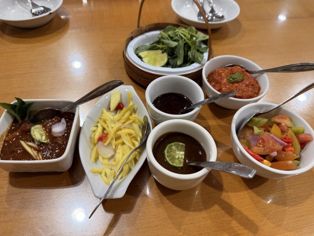 テーブルには焼き魚とエビ、そして6種類のサンバルがずらりと並びました。色も香りもまったく異なるその光景は、まるで小さな“味の博物館”のようでした。