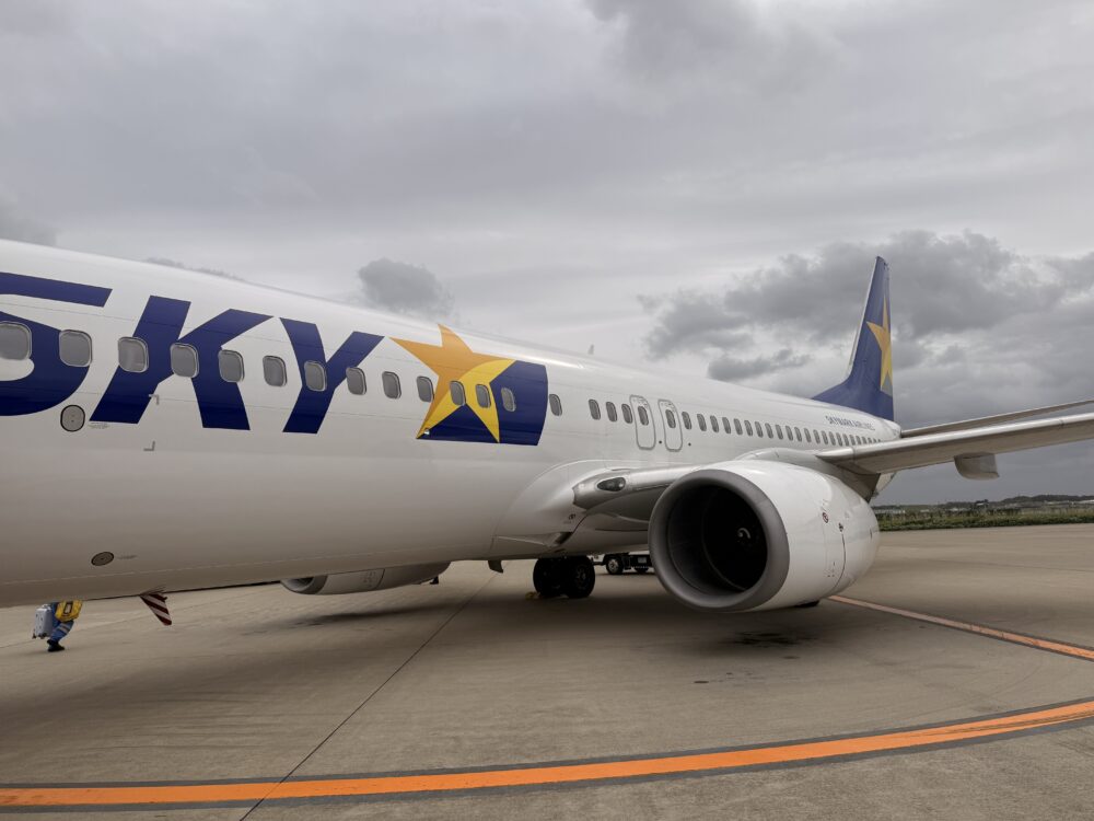 滑走路の向こうにはピーチやスカイマークの機体が並び、空港全体が活気に満ちています。