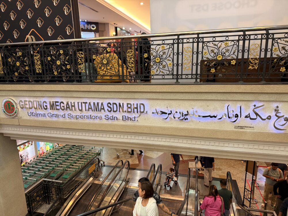 モールの中でひときわ賑わっていたのが、大型スーパーマーケット「Gedung Megah Utama Sdn. Bhd.」です。看板にはローマ字表記とアラビア文字が併記されていて、ブルネイらしさがよく表れています。