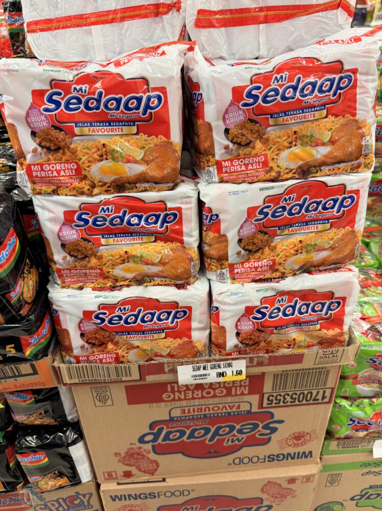 特に目立っていたのが、インドネシア製の加工食品です。インスタント麺のコーナーに行くと、Indomie(インドミー)、Mi Sedaap(ミー・スダップ)が山のように積まれていました。